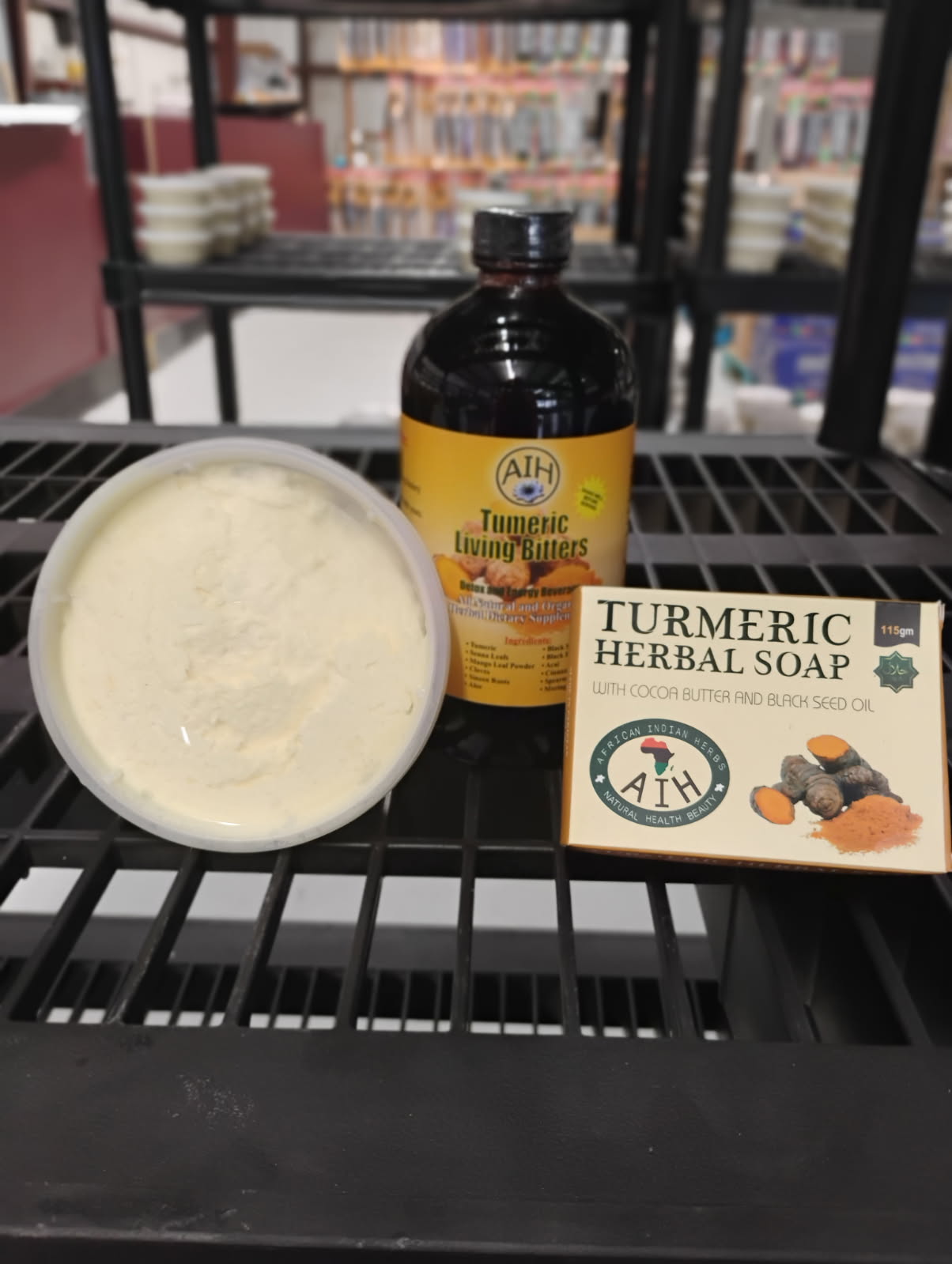 Shea Butter, Tumeric Living Bitters and Turmeric Herbal Soap.